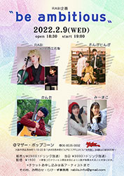 | 9 | 水 | -RABI企画-be ambitious 出演 ■RABI ■ホンがヒンが ■み~まこ ■かんた ▼チケットお申込み・お9問い合わせ RABI 公式LINE https://lin.ee/X4X5yyL ・7/2Live・お名前・チケット枚数をご記入下さい。 ▼配信チケット購入 *配信ライブチケットは1500yenです。 *配信ライブチケット以下からクリックしてお買い求め下さいお買い求め下さい。 配信ライブチケット販売ページです。 *2週間アーカイブは残しますので2/23 までご覧になれます。 |