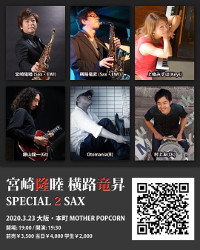 | 23 | 月 | <本イベントは6月12日へ延期となります>宮崎隆睦 横路竜昇 Special 2Sax 宮崎隆睦(Sax・EWI) 横路竜昇(Sax・EWI) 上條みずほ(Keys) 藤山龍一(Gt) Otomania(B) 村上友(Ds) |