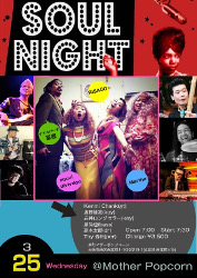 | 25 | 水 | Izumi Nagoya PresentsSOUL NIGHT RISACO (Vo) aquvi divivdoo (Vo) Martha..(Vo) ナイルパーチ富樫 (Vo) Kenmi Chank(gt) 坂野雄亮(key) 岩井ロングセラー(key) 泉尚也(bass) 高木太郎(dr) Toy 森松(per) |