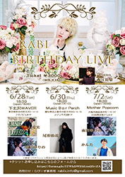 | 2 | 土 | RABI BIRTHDAY LIVE☆RABI 西江花梨 ☆雨宮ゆりの ☆かんた 配信チケット 1500yen *配信ライブチケット以下からクリックしてお買い求め下さいお買い求め下さい 配信ライブチケット販売ページです。 *2週間アーカイブは残しますので7/16 までご覧になれます。 |