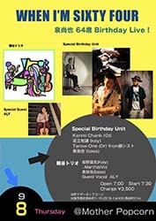 | 8 | 木 | Special Birthday UnitKenmi Chank (Gt) 足立知謙 (key) Tarow-One (Dr) from韻シスト 泉尚也 (bass) 鰻谷トリオ 坂野雄亮(Key) ..Martha(Vo) 泉尚也(bass) Guest Vocal ALY |