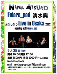 | 25 | 日 | NINA ATSUKOFulare_pud 清水興 お久しぶりLIve in Osaka 2022 ▼予約メール motherpopcorn7@gmail.com お名前 ご予約人数 お電話番号 のご記載お願い致します。 |