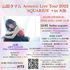 | 28 | 水 | シンガーソングライター山田タマルアコースティックライブツアー開催決定! 山田タマル Acoustic Live Tour 2022 'AQUARIUS' +in 大阪 【出演】 山田タマル(vo,gt) 堀口和子(vln) 野口亮(gt) 《Guest》 天野裕士(TVプロデューサー) 【ご予約方法】 予約アドレスを受信設定してからご予約をお願い致します。 タイトルに『山田タマルライブ予約』と記入して本文に (1)ご予約氏名 (2)ふりがな (3)ご予約人数 (4)ご連絡電話番号 (5) メールアドレス を必ずご記入のうえ liveyoyakujimukyoku@gmail.com までお申込みをお願い致します。 《簡単楽々予約メール作成リンク》 http://mail-to.link/m8/cohhmh 上記予約メール作成リンクをクリック、または写真のQRコードを読みとり メールを作成から文中の『メール作成画面はこちら』の文字をクリックすると簡単にメールが作成できます。 ◎1通ずつ内容を確認し、折り返し本公演予約専用アドレスよりご予約受付メールを返信させて戴きます。 (受付メールの返信は、手作業のためお時間を頂戴致します。) ☆本公演は公演日当日のガイドラインに沿っての運営をおこなっております。 お客様には受付にて手指消毒と検温を実施させて戴きます。 また、ご飲食時以外やライブ中はなるべく不織布マスク着用をお願い致します。 ☆感染拡大等などの状況により公演を延期、中止とさせて戴く場合もございますのであらかじめご了承願います。 ☆会場・道順に関するお問い合わせは… TEL 06-6535-0002 Mother popcornまでお願い致します。 (平日17:00?23:00) 【企画/製作】PEARL DEW MUSIC 【協力】オフィス串 【会場運営】Mother Popcorn 文化庁「ARTS for the future!2」補助対象事業 |